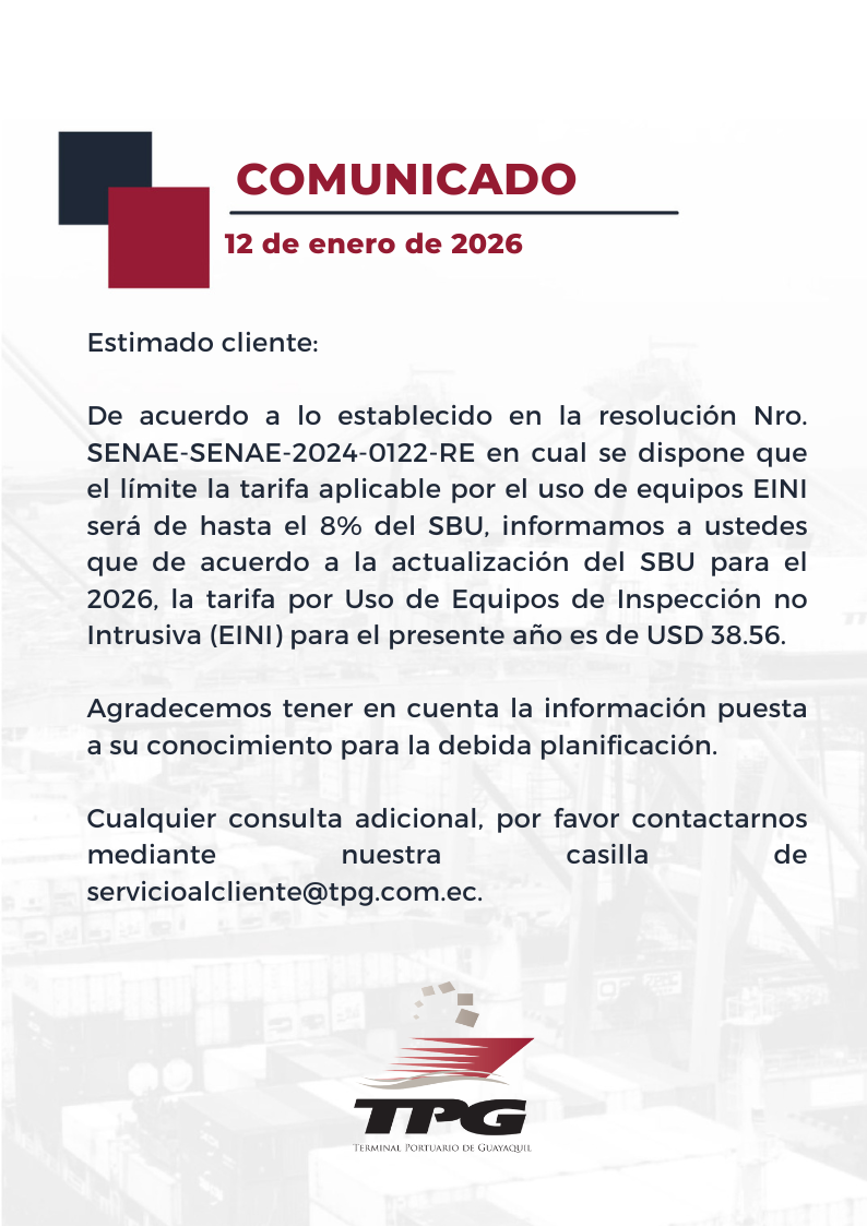 Cobro escaners / Informe a SENAE por cobro de tarfias de ESCANER 12 Ene Publicado por TPG Categoría: ComunicadosNoticiasTPG No hay comentarios Deja una respuesta Cancelar la respuesta Post Comment