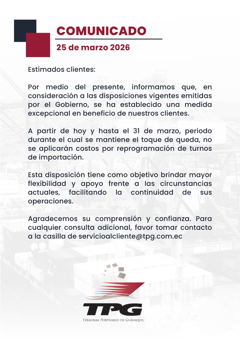 COMUNICADO: REPROGRAMACIÓN DE TURNOS DE IMPORTACIÓN 25 Mar Publicado por TPG Categoría: ComunicadosNoticiasTPG No hay comentarios Deja una respuesta Cancelar la respuesta Post Comment